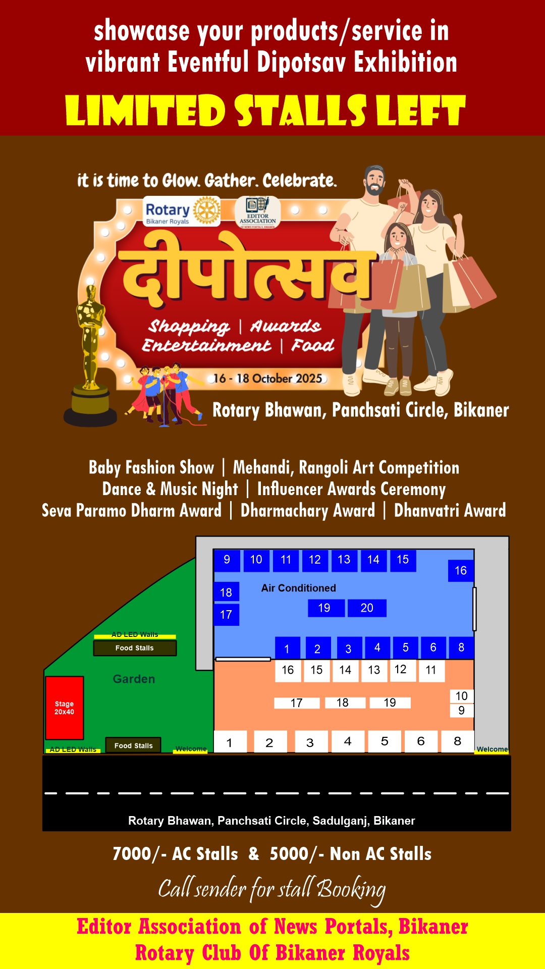 इस दीपोत्सव में स्टॉल बुकिंग के लिए आप आनंद आचार्य 9929452644 पर संपर्क कर सकते है।