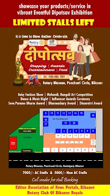दीपोत्सव मेले के प्रति उत्साह, एक ही दिन में 20 स्टॉल बुबीकानेर, 5 अक्टूबर। रोशनी और उमंग का पर्व दीपावली इस बार बीकानेर में एक नए रंग-रूप के साथ मनाया जाएगा। एडिटर एसोसिएशन ऑफ न्यूज पोर्टल्स बीकानेर और रोटरी क्लब बीकानेर रॉयल्स के संयुक्त तत्वावधान में 16 से 18 अक्टूबर तक रोटरी भवन, पंचशती सर्किल, सादुलगंज में तीन दिवसीय दीपोत्सव 2024 का आयोजन होगा। यह आयोजन खरीददारी, सम्मान और मनोरंजन की त्रिवेणी के रूप में होगा, ताकि हर वर्ग अपने अंदाज में दीपोत्सव मना सके। यह केवल बाजार या मेला नहीं होगा, बल्कि संस्कृति, साहित्य, सेवा और सम्मान का अनूठा संगम बनेगा।
