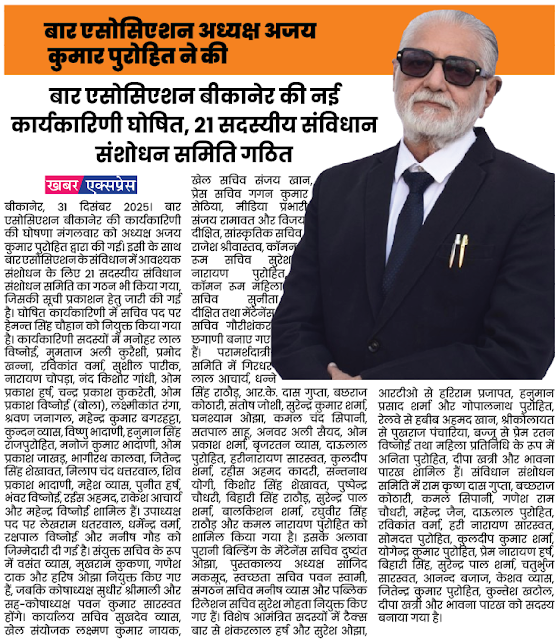 बीकानेर, 31 दिसंबर 2025। बार एसोसिएशन बीकानेर की कार्यकारिणी की घोषणा मंगलवार को अध्यक्ष अजय कुमार पुरोहित द्वारा की गई।