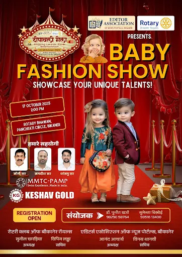 बीकानेर, 10 अक्टूबर। नन्हें सितारों के लिए यह अवसर है कि वे अपने बच्चे को दीपोत्सव बेबी फैशन शो का हिस्सा बनाकर अपनी चाल-ढाल और प्रतिभा दिखाएँ। 17 अक्टूबर को रोटरी भवन में आयोजित इस शो में बच्चों की मुस्कान और अंदाज पूरे मेले को और रंगीन बनाएंगे। आपका बच्चा भी इस मंच पर चमक सकता है और छोटे कदमों के साथ बड़े अंदाज में अपनी शैली प्रदर्शित कर सकता है। बेबी फैशन शो 2025 नन्हें प्रतिभाओं के लिए खास मौका है, जिसमें नि:शुल्क प्रविष्टि के माध्यम से वे अपने टैलेंट को दर्शकों और जजों के सामने पेश कर सकते हैं। इस आयोजन में नन्हें मॉडल्स की चमक रोटरी भवन पर जगमगाएगी और आपके बच्चे की मुस्कान और स्टाइल को मिलेगा उपयुक्त मंच।