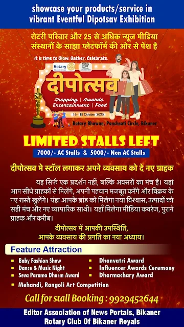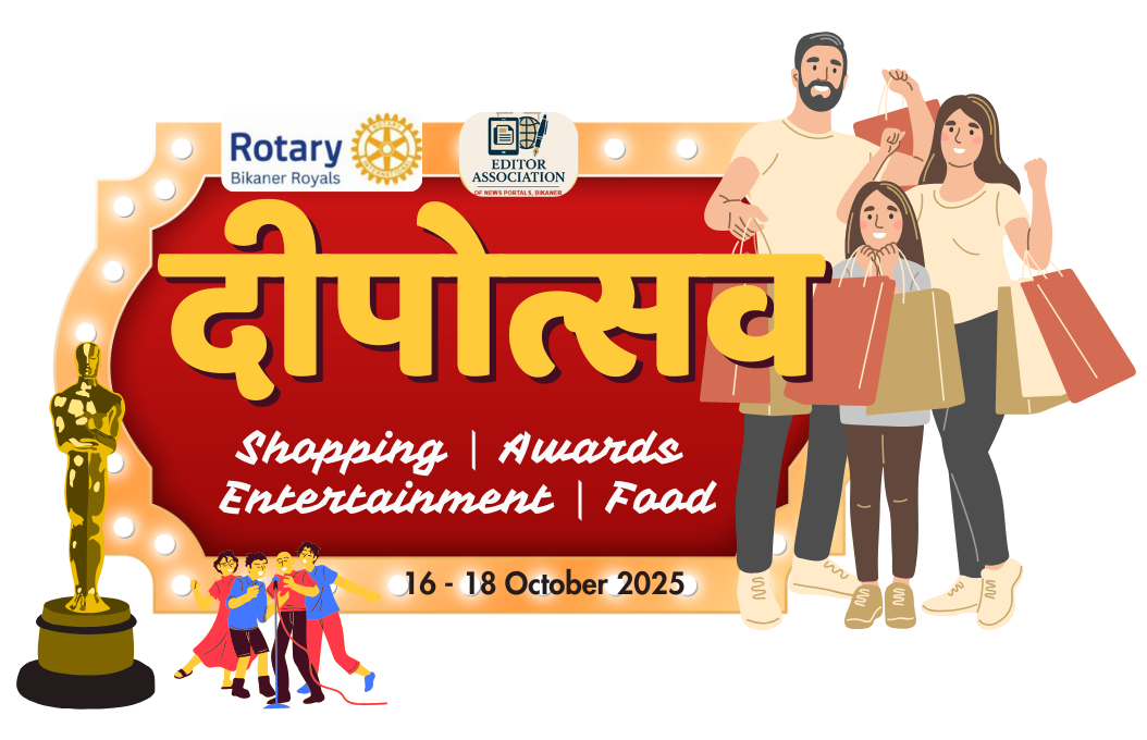 बीकानेर, 5 अक्टूबर । रोशनी और उमंग का पर्व दीपावली इस बार बीकानेर में एक नए रंग-रूप के साथ मनाया जाएगा। एडिटर एसोसिएशन ऑफ न्यूज पोर्टल्स बीकानेर और रोटरी क्लब बीकानेर रॉयल्स के संयुक्त तत्वावधान में 16 से 18 अक्टूबर तक रोटरी भवन, पंचशती सर्किल, सादुलगंज में तीन दिवसीय दीपोत्सव कार्यकर्म का आयोजन किया जा रहा है। दीपोत्सव के तहत खरीददारी, सम्मान समारोह, और मनोरंजन के कार्यक्रमों को त्रिवेणी के रूप मे आयोजित किया जा रहा जिससे हर वर्ग अपने अंदाज़ मे दीपोत्सव मना सके. यह आयोजन केवल खरीदारी और मनोरंजन का मेला नहीं होगा, बल्कि इसमें संस्कृति, साहित्य, सेवा और सम्मान की अनूठी छटा भी देखने को मिलेगी।
