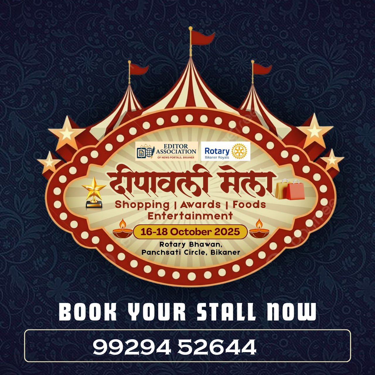 इस दीपोत्सव में स्टॉल बुकिंग के लिए आप आनंद आचार्य 9929452644 पर संपर्क कर सकते है।