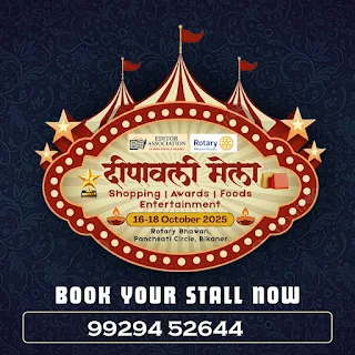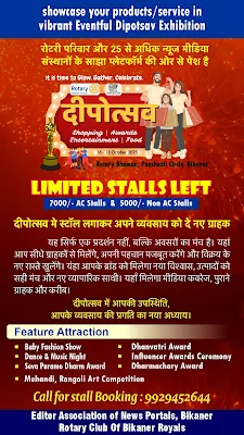 दीपोत्सव मेले के प्रति उत्साह, एक ही दिन में 20 स्टॉल बुबीकानेर, 5 अक्टूबर। रोशनी और उमंग का पर्व दीपावली इस बार बीकानेर में एक नए रंग-रूप के साथ मनाया जाएगा। एडिटर एसोसिएशन ऑफ न्यूज पोर्टल्स बीकानेर और रोटरी क्लब बीकानेर रॉयल्स के संयुक्त तत्वावधान में 16 से 18 अक्टूबर तक रोटरी भवन, पंचशती सर्किल, सादुलगंज में तीन दिवसीय दीपोत्सव 2024 का आयोजन होगा। यह आयोजन खरीददारी, सम्मान और मनोरंजन की त्रिवेणी के रूप में होगा, ताकि हर वर्ग अपने अंदाज में दीपोत्सव मना सके। यह केवल बाजार या मेला नहीं होगा, बल्कि संस्कृति, साहित्य, सेवा और सम्मान का अनूठा संगम बनेगा।